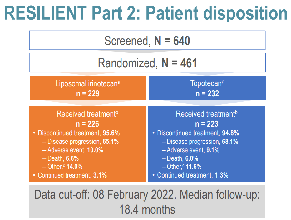 RESILIENT试验第2部分是一项随机、开放标签、III期研究,纳入了461例一线铂类化疗后发生了放射学证实的疾病进展的SCLC患者,ECOG体能状态评分为0或1分,以1∶1比例随机分组接受脂质体伊立替康(70 mg/m2,每2周1次)静脉给药或拓扑替康(1.5 mg/m2,持续5天,每3周1次)静脉给药。治疗持续至疾病进展或出现不可耐受的毒性。除OS是本研究的主要终点外,PFS和盲法独立中心审查委员会(BICR)评估的ORR是关键次要终点。