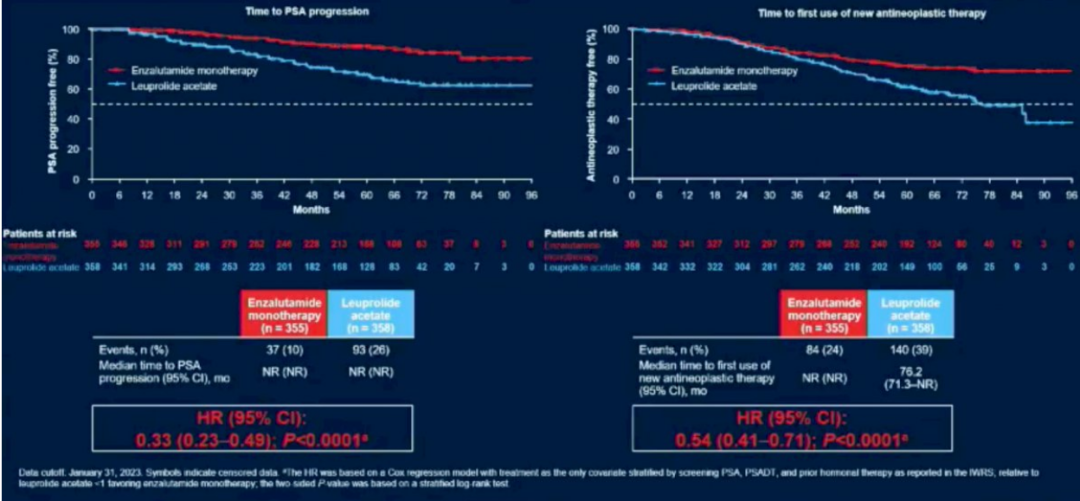 至首次使用新抗肿瘤治疗的时间方面,恩扎卢胺联合组也有显著延长(HR 0.36,95%CI:0.26~0.49,P<0.0001)。