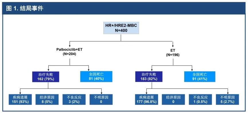 研究共纳入400例HR+/HER2-晚期乳腺癌女性患者。204例(51%)接受PAL+ET治疗,196例(49%)接受ET治疗。截至观察终点,两队列分别162例(79%)和183例(93%)患者出现治疗失败,失败原因包括:疾病进展(93.2%vs.96.8%)、经济无法承担(4.9%vs.0%)、不良反应无法耐受(1.9%vs.0.5%)和其他未知原因(0%vs.2.7%)。大多数患者为绝经后女性(71.8%)、合并内脏转移(65.2%)。13.0%患者为初治Ⅳ期,45.2%患者接受了一线内分泌治疗。超过一半的患者(57.8%)使用AI,38.5%使用氟维司群。