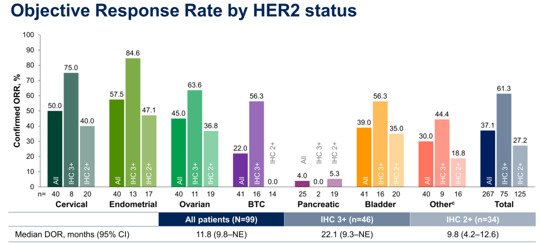 刘强教授:我们知道HER2最早作为乳腺癌的治疗靶点,因其在其他实体瘤也存在表达或基因突变,后来也开始应用于肺癌、胃癌等其他实体瘤治疗,但是这些肿瘤的HER2表达比例相对偏低,大分子抗HER2疗效有限。T-DXd作为新一代ADC,高药物抗体比(DAR=8)、连接子可裂解和载荷膜穿透性带来的旁观者效应等,使其疗效不完全依赖于HER2表达水平。这次ASCO大会报道的DESTINY-PanTumor02研究,将T-DXd用于宫颈癌、子宫内膜癌、卵巢癌、胆道癌、胰腺癌、膀胱癌等泛瘤中晚期治疗中,结果显示除胰腺癌以外,大多数瘤种对T-DXd均有积极疗效,而且不同HER2表达水平(IHC 2+或3+)的患者均有治疗反应。