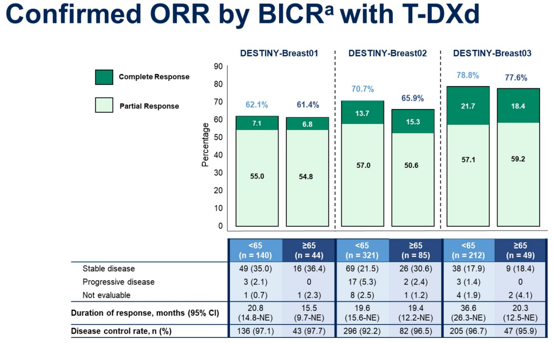 我们知道,欧美国家的乳腺癌中位发病年龄大约为63岁,老年患者非常多;而我国的人口基数大,也有不少年龄偏大的患者。老年患者对抗肿瘤治疗的耐受性总体上要差一些,新型药物在这部分人群中的疗效和安全性一直是大家比较关心的话题。这次ASCO大会报道的这项DB-01、02、03研究的汇总分析,对分析此类人群而言非常有价值。因为DESTINY-Breast系列正在向晚期一线、早期(新)辅助治疗拓展,这些特殊人群的数据对其他研究也会有很好的启示。