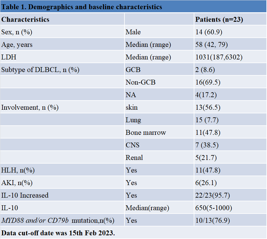 截至2023年2月14日,本研究共纳入23例患者,中位年龄59岁,男性14例,均为Ann Arbor IV期且属于有中高危分组(IPI 3-5分)。基线参数见表1。