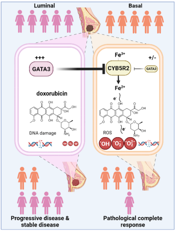 乳腺癌是女性中发病率最高的肿瘤,其中luminal型(包括luminal A型和luminal B型)占比达70%。新辅助化疗是乳腺癌主要的术前治疗手段之一,为患者增加了手术机会。新辅助化疗敏感的患者术后预后更好,复发风险更低(Chen et al.,2004;Spring et al.,2020)。然而luminal型乳腺癌患者新辅助化疗后病理完全缓解率仅有大约10%(Cortazar et al.,2014),解析该型患者新辅助化疗耐药机制具有重要的临床意义。江苏省人民医院唐金海教授团队最新发现luminal型乳腺癌内的关键基因GATA3过表达可以抑制阿霉素在肿瘤细胞内的还原态过载,从而导致肿瘤细胞的凋亡和铁死亡减少,导致阿霉素耐药。相关学术成果日前被Drug resistance updates接收(IF=24.3),已于Drug resistance updates官网在线发表。