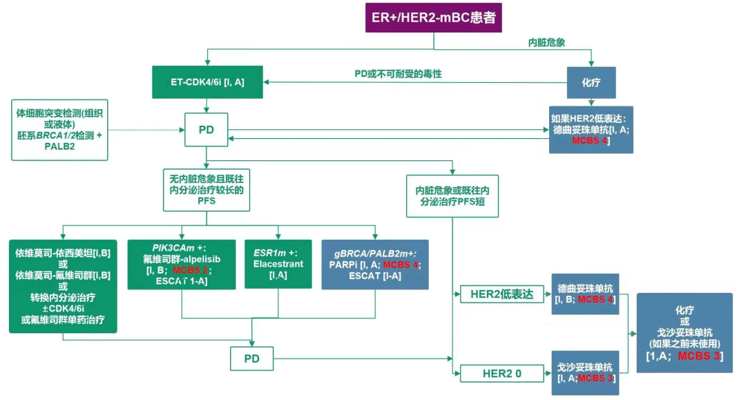 图2.ESMO-MBC指南ER+/HER2-mBC患者的治疗推荐