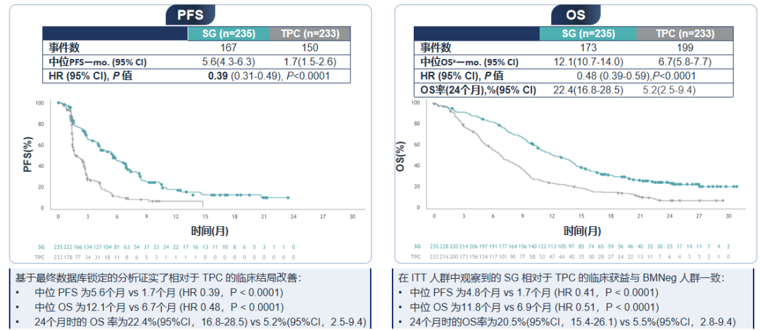 SG在既往接受过至少二线化疗(至少一线用于复发转移阶段)的转移性三阴性乳腺癌(mTNBC)患者中表现出显著临床效果。相较于医生选择治疗(TPC),SG在PFS(5.6 vs.1.7个月,HR=0.39)和OS(12.1 vs.6.7个月,HR=0.48)方面,均表现出明显改善。