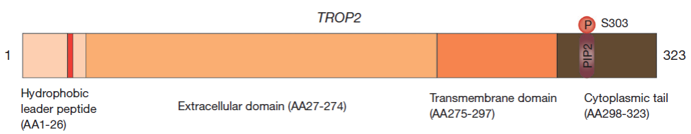 Trop-2属于TACSTD家族,最初在人胎盘滋养层中发现,随后发现在多数人类肿瘤细胞中高表达。Trop-2蛋白由4个结构组成:蛋白由疏水前导肽(AA1–26)、胞外结构域(ECD)(AA27–274)、跨膜结构域(AA275–297)和胞质尾部(AA298–323)。Trop-2的胞内结构能够被PIP2进行磷酸化,同时胞质尾部存在酪氨酸和丝氨酸磷酸化位点,这表明PIP2对Trop-2的信号转导具有重要影响。这种结构特征对Trop-2后续的作用机制产生了重大影响。
