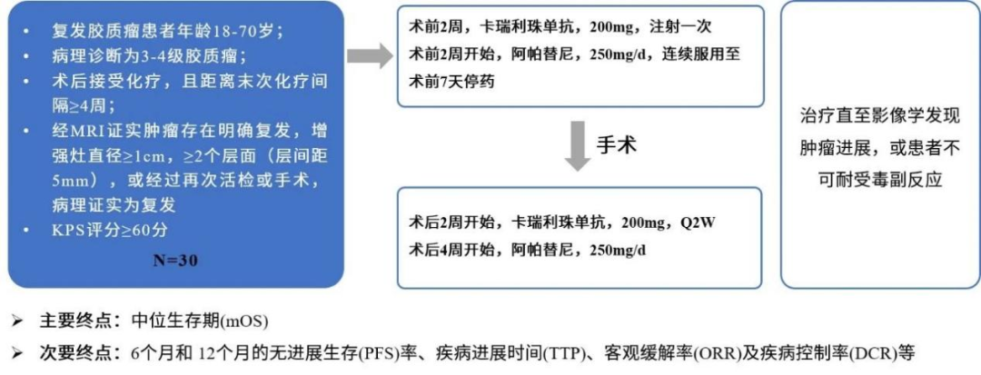 陈忠平教授:该研究是一项单中心、单臂、前瞻性临床研究(NCT04588987)。主要入组标准为:复发胶质瘤患者,年龄18~70岁;病理诊断为3~4级胶质瘤;KPS评分≥60分,具有手术切除指征(基本要求)。排除标准:之前接受过免疫治疗及抗肿瘤血管生成药物治疗。