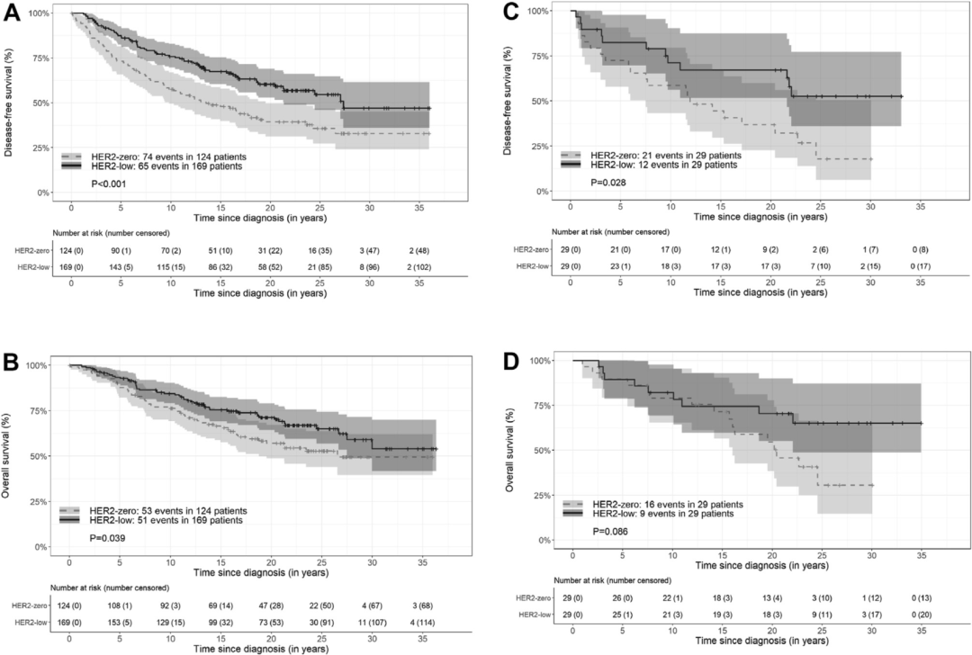 在351例HER2阴性患者中,198例(56.4%)为HER2-low组,153例(43.6%)为HER2-0组。HER2-0和HER2-low组间存在显著差异,具体为病理分级(P=0.001),Ki-67(P=0.013)和HER2基因表达(P=0.002)。HER2-low患者有更长的无病生存期(DFS)(15年DFS率:67.5%[95%CI 61.0-74.7]vs.47.3%[95%CI 39.9-56.1],P<0.001)和更长的总生存期(OS)(15年OS率:75.4%[95%CI 69.4–81.9] vs. 66.8%[95%CI 59.5-74.9],P=0.009)。在激素受体(HR)阳性中观察到OS差异(P=0.039),而在HR阴性没有差异(P=0.086)。多变量分析证实了HER2状态的独立预后意义(DFS:HR,0.546; 95%CI,0.402-0.743; P<0.001; OS:HR,0.653; 95%CI,0.458-0.932; P=0.019) 。