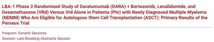 达雷妥尤单抗(DARA)+硼替佐米、来那度胺和地塞米松(VRd)与单用VRd在符合自体干细胞移植(ASCT)条件的新诊断多发性骨髓瘤(NDMM)患者中的3期随机Perseus试验的主要结果
