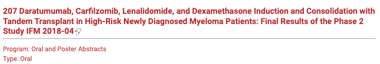 在Cyrille Touzeau教授等开展的IFM-2018-04研究(abstract 207)当中,应用达雷妥尤单抗联合KRD方案(卡非佐米/来那度胺/地塞米松)+双次自体干细胞移植(ASCT)治疗适合移植的高危、新诊断多发性骨髓瘤(HR-NDMM)患者,其高危的定义为del17p,t(4;14)和(或)t(14;16),其研究结果显示,经过治疗后的总体有效率(ORR)达到了100%,其中94%患者能达到微小残留病(MRD)阴性,MRD阴性对于HR-NDMM患者非常重要,因此该方案对于高危患者极其有价值。