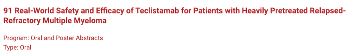 在一项真实世界研究(abstract 91)中,美国的五家临床研究中心纳入了102例既往重度治疗的难治/复发多发性骨髓瘤患者(RRMM),应用靶向BCMA/CD3双特异性抗体Teclistamab进行治疗,其结果显示,客观有效率(ORR)为59%,值得指出的是,这是真实世界研究的疗效且患者为高度难治,因此其疗效也非常令人鼓舞。