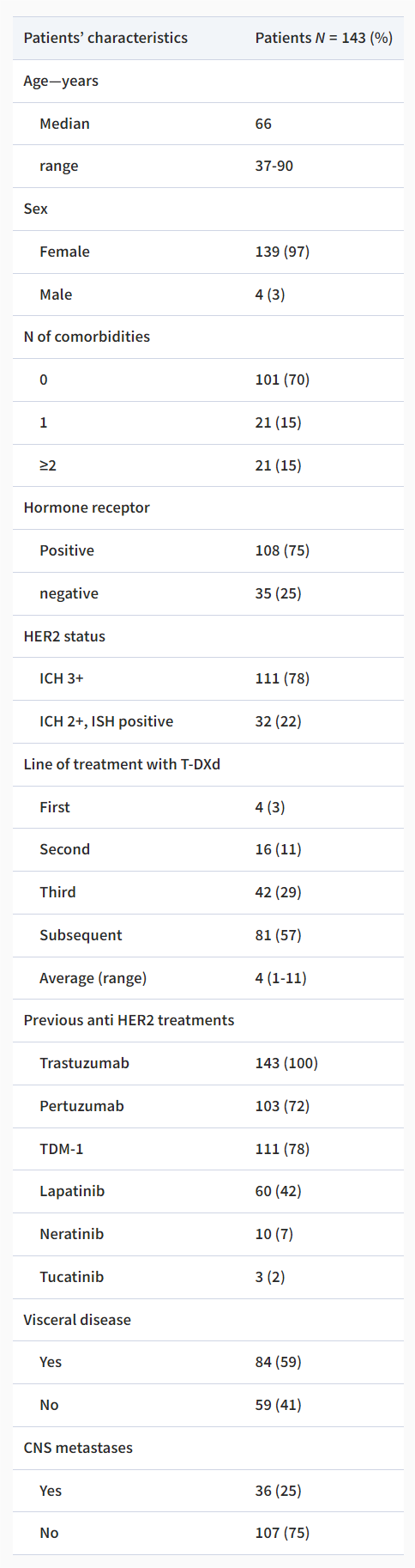 2021年4月至2022年10月,共纳入143例患者。中位年龄为66岁(范围:37~90岁),其中包括4名(3%)男性患者。在所有患者中,108例(75%)患者的激素受体(HR)状态为阳性(HR+/HER2+),其余35例(25%)为阴性(HR-/HER2+)。分别有4例(3%)、16例(11%)、42例(29%)和81例(57%)患者接受了T-DXd的一线、二线、三线或后线治疗。转移性疾病中位既往治疗线数为4线(范围:1~11)。截至数据截止时,143例患者中有78例(54%)仍在接受T-DXd治疗。