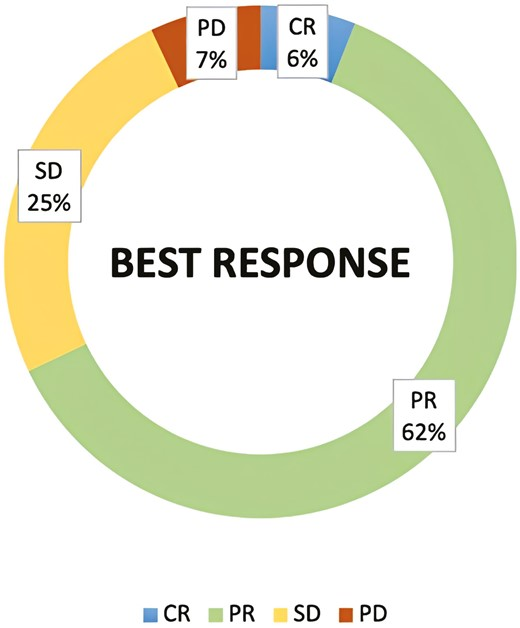 在123例可测量疾病患者中,有9例(6%)CR、74例(62%)PR和30例(25%)SD,ORR为68%,DCR为93%。9例(7%)患者出现了原发性耐药。