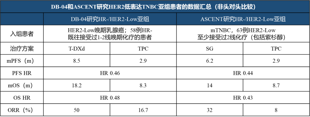 DB-04研究和ASCENT研究的HER2-Low样本量均不大,但DB-04是预设亚组分析,不需要单独计算样本量,只需要基本符合目标人群的流行病学特征即可;而ASCENT研究为事后分析,并非预设分析。此外,DB-04研究入组患者相对更加靠前(至少经1-2线化疗),而ASCENT研究相对更偏后(至少经2线化疗)。