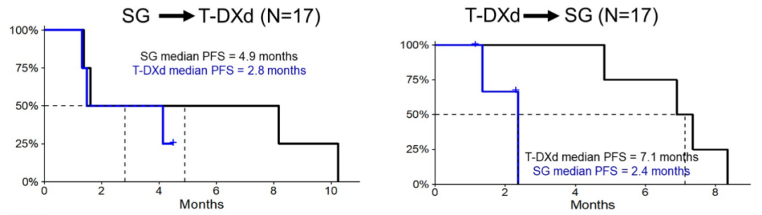 2023年ASCO大会报道的一项美国多中心回顾性研究中,在真实世界中分析了不同ADC的治疗顺序。该研究纳入接受过两种ADC药物治疗的晚期乳腺癌患者,排除了HER2阳性患者。值得注意的是,在T-DXd序贯SG的HR+/HER2-患者中,T-DXd和SG的中位PFS则分别为7.1个月和2.4个月;而在SG序贯T-DXd的HR+/HER2-患者中,SG和T-DXd的中位PFS分别为4.9个月和2.8个月[10]。这些结果证实了T-DXd在HER2-Low患者中优先使用的生存获益给出了一定的数据支持,但仍需要进一步的前瞻性研究验证。