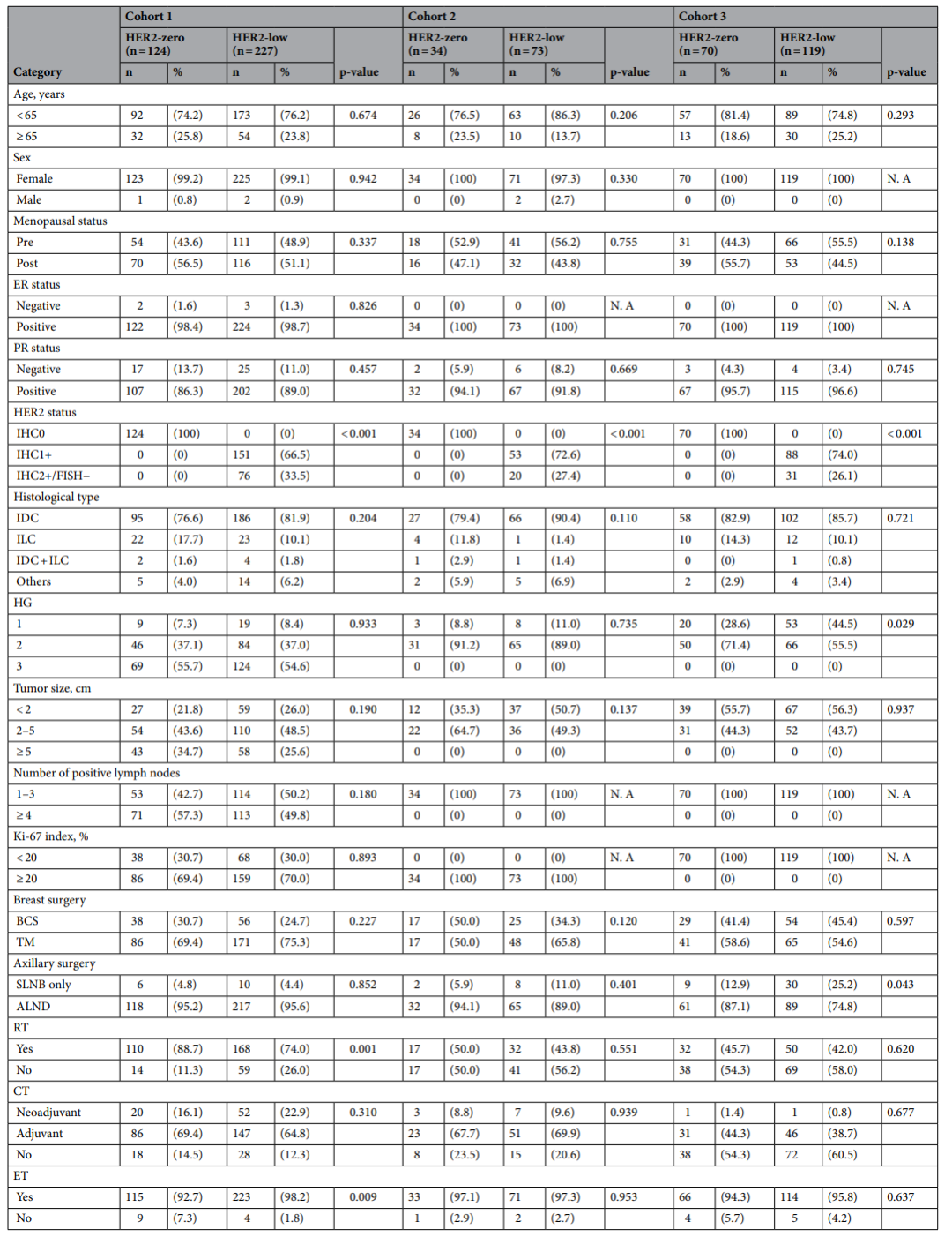 本研究回顾性纳入了2011年1月至2019年12月期间,在日本国家癌症中心的647例淋巴结阳性HR+/HER2-原发性早期乳腺癌患者,其中HER2 0 228例,HER2低表达419例。按复发风险分为三个队列,分别为队列1(351例):组织学分级(HG)为3或肿瘤大小≥5cm伴有腋窝淋巴结(ALN)阳性1-3枚,或ALN≥4枚;队列2(107例):HG<3、肿瘤大小<5cm、Ki67≥20%伴有腋窝淋巴结(ALN)阳性1-3枚;队列3(189例):HG<3、肿瘤大小<5cm、Ki67<20%伴有腋窝淋巴结(ALN)阳性1-3枚。比较每个队列HER2 0(IHC 0)和HER2低表达(IHC2+/FISH-或IHC1+)之间的无侵袭性疾病生存率(IDFS)和无远处复发生存率(DRFS)。