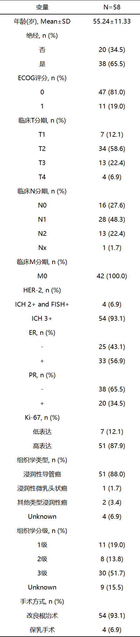 研究结果:该研究共纳入58例患者,诊断为AJCC I期、II期和III期的患者分别占3.4%、60.3%和36.2%。超过一半患者(58.6%)激素受体(HR)阳性。行乳腺癌改良根治术患者占绝大多数(93.1%)。入组患者基线特征详见表1。