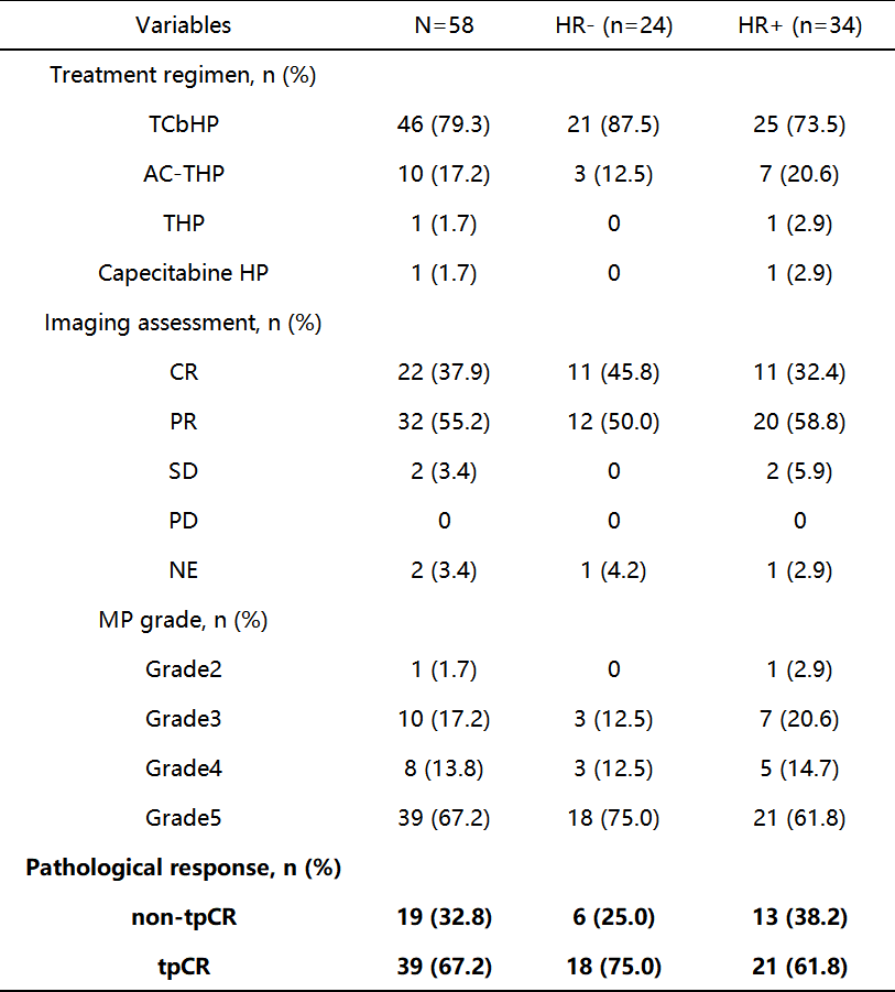 新辅助治疗阶段汉曲优的中位给药周期为6个周期(四分位数间距[IQR],4~6)。最常见的化疗药物是多西他赛联合卡铂(TCbHP,79.3%),其次是蒽环类联合紫杉烷(AC-THP,17.2%),在纳入研究分析的58例患者中有39例(67.2%)达到pCR,该结果与既往各临床试验的结果基本一致。HR+和HR-患者的pCR率分别为61.8%(21/34)和75.0%(18/24)。根据患者接受的不同化疗方案分析,TCbHP组46例患者pCR率为65.2%(30/46),AC-THP组10例患者pCR率为80.0%(8/10),THP组1例患者未达pCR。且未观察到严重的不良事件。不同治疗方案及有效性结果见表2。