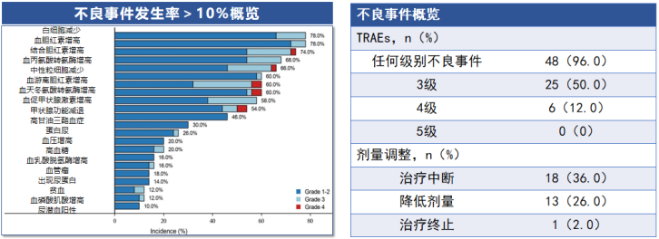 结果显示,33例患者肿瘤大小退缩超过30%;在第一次影像学评估中达到PR有11例(22.9%)(图1)。疗效方面,ORR达到66.7%(95%CI 51.6~79.6),DCR为91.7%(95%CI 80.0~97.7)(图2),意向治疗(ITT)人群中位PFS为18.4个月(95%CI 10.6~未达到),中位OS未达到(95%CI,未达到-未达到)。相较于LDH高表达和疗效为疾病稳定(SD)的患者,LDH低表达组和PR的患者在PFS和OS上获益更明显(P<0.05)(图3)。卡瑞利珠单抗+阿帕替尼+替莫唑胺联合治疗表现出积极的抗肿瘤活性且安全性可控(图4)。此次更新的推荐意味着这种联合治疗方案在疗效和安全性方面得到了更多的认可,并有可能成为未来治疗该类型黑色素瘤的首选方案之一。